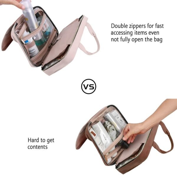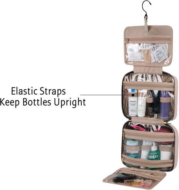 Special Design: Inner main pockets with elastic straps hold bottles upright; double zipper compartment for easy access to the items even not fully open the bag; Transparent sides for providing clear overview of contents