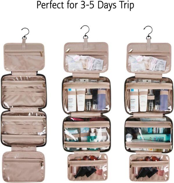 Large Capacity – 12.6 x 9.1 x 4.3 inch (fold); 12.6 x 33.5 inch(unfold) 4 separate compartments with zip and back open pocket for great organization. Suitable for your family trip to pack all men, women , and kids toiletries