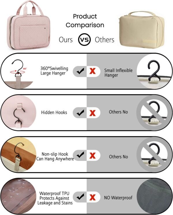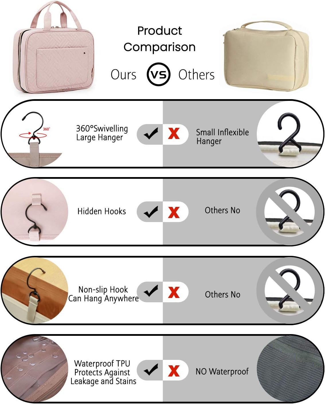 Easy to Use: Stow-away 360-degree swivel non-slip metal hook for versatile hanging options; Two-way zipper closure for quick access; Carry handle doubles as its hanging strap